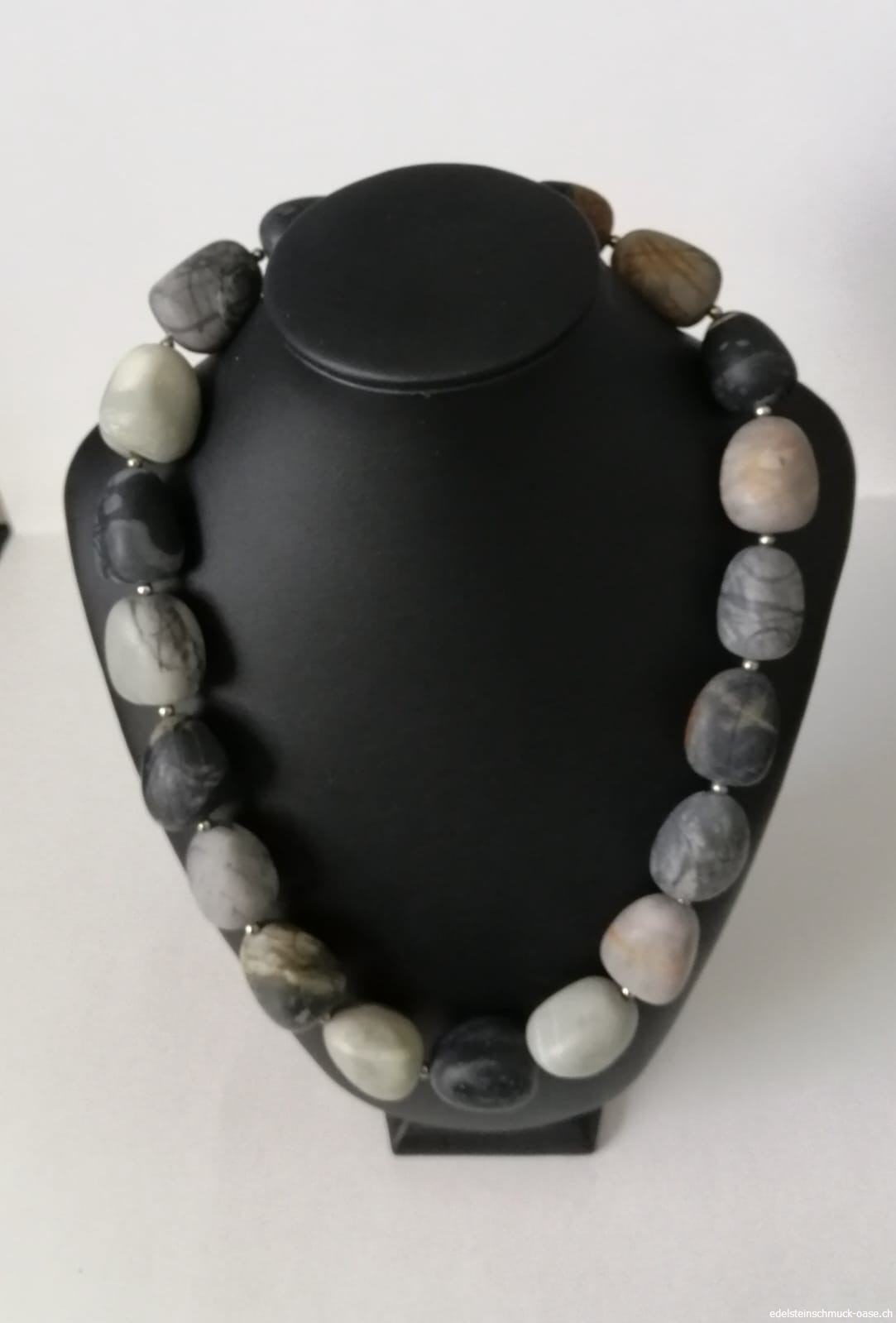 Picasso Jaspis Halskette Länge: 48 cm Nuggets ca. 18 x 22 mm Zwischenteile und Karabinerverschluss Silber Rhodiniert